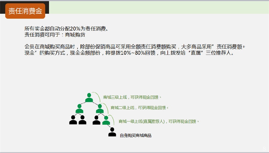 公司将你获得奖金的20%截流到商城,称为责任消费金,可以在商城购物或者购买其他服务,部分产品可以用责任消费金兑换,部分产品需要现金 消费金;其中现金部分10%---80%分配给你的上面三代人,也就是之前流行的微商的三级分销。